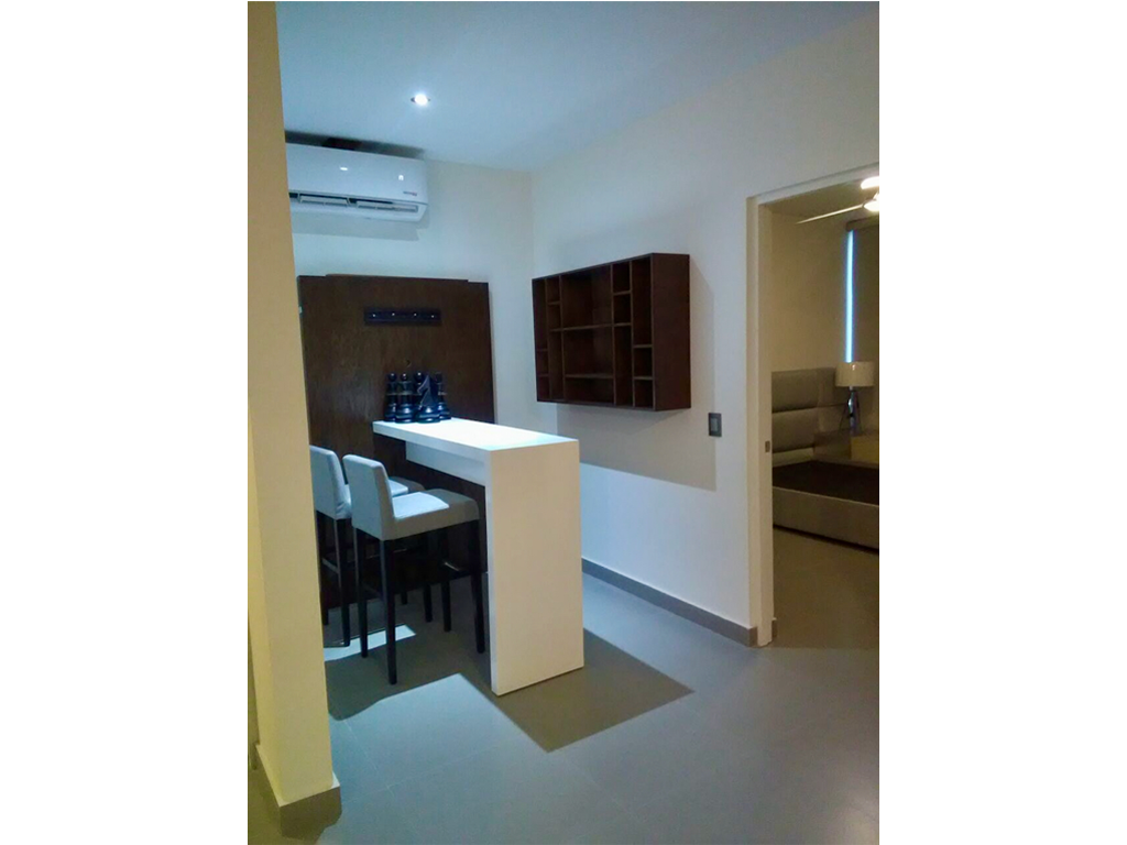 Este proyecto fue hecho para un departamento para rentar, tuve que utilizar muebles y decoración basados en una decoración para todos los gustos, con muebles duraderos y funcionales para aprovechar todas las áreas. Propuse la sala España, ya que con su diseño en escuadra, se aprovecha al máximo su espacio y su función de hacerse cama hace que sea para varios usos y con un mueble de TV convirtiendo esta sala también en un área familiar. Se propuso mesa de centro de tronco para darle un toque orgánico, ya que por ser un producto natural y duradero es muy recomendable para el uso rudo que se le llegara a poder dar. En el comedor, se optó por elegir un comedor en cristal para dar la sensación de mayor amplitud con 6 sillas en tonalidad gris por ser un color fuerte para las manchas, además de un espejo recargado el cual le da un toque de mayor profundidad. Este departamento cuenta con un área pequeña entre comedor y recamaras en el cual se pensó cubrir con una red de escritorios, pero al retroalimentarnos con el cliente, se optó por amueblarlo con un área de bar y 4 banquitos para complementar el área de comedor y ser de mayor comodidad para cuando la persona que había tenga alguna visita.